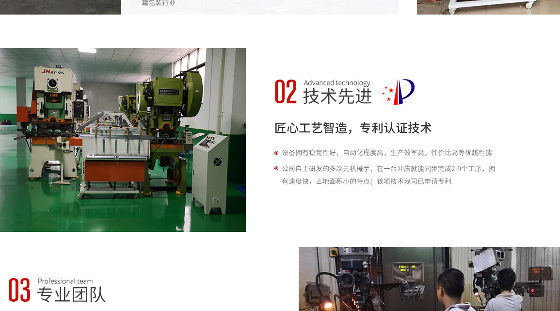 東莞市勝賢機(jī)械設(shè)備有限公司,是一家專業(yè)從事金屬制罐包裝行業(yè)的整套自動(dòng)化設(shè)備和模具開發(fā)、制造與銷售的公司,擁有成熟的技術(shù)和創(chuàng)新開發(fā)能力。我們擁有有一批多年從事設(shè)計(jì)、研究開發(fā)的工程師,和設(shè)備、模具制作的技術(shù)人才。不斷推進(jìn)制罐行業(yè)向高效、環(huán)保、節(jié)能、操作簡(jiǎn)易化的方向發(fā)展。 公司主要產(chǎn)品:多次元機(jī)械手設(shè)備生產(chǎn):含片盒蓋/底自動(dòng)生產(chǎn)線,煙盒蓋/底自動(dòng)生產(chǎn)線,醫(yī)藥盒蓋/底自動(dòng)生產(chǎn)線,茶葉罐蓋圈/酒罐蓋圈自動(dòng)生產(chǎn)線,酒罐蓋自動(dòng)生產(chǎn)線、茶葉罐拍底自動(dòng)生產(chǎn)線等等。 罐身自動(dòng)扣骨機(jī)生產(chǎn):茶葉罐/酒罐/化妝品罐/內(nèi)衣罐等等. 其中多次元機(jī)械手專為兩片盒的生產(chǎn)和三片罐的蓋、底、蓋圈、拍底蓋等的生產(chǎn)而設(shè)計(jì),...
